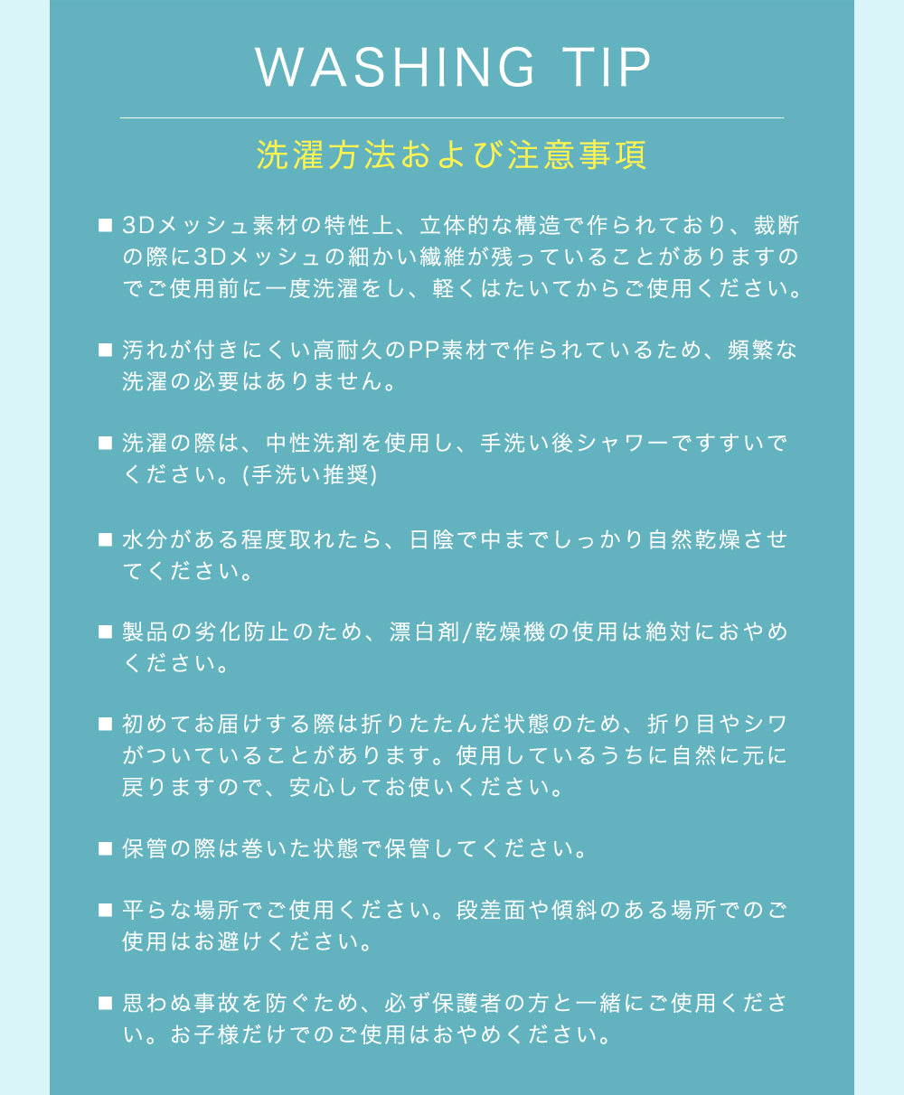 ・裁断の際の透明な柱糸がマットの表面についている場合があるため、洗濯してからのご使用をおすすめいたします。