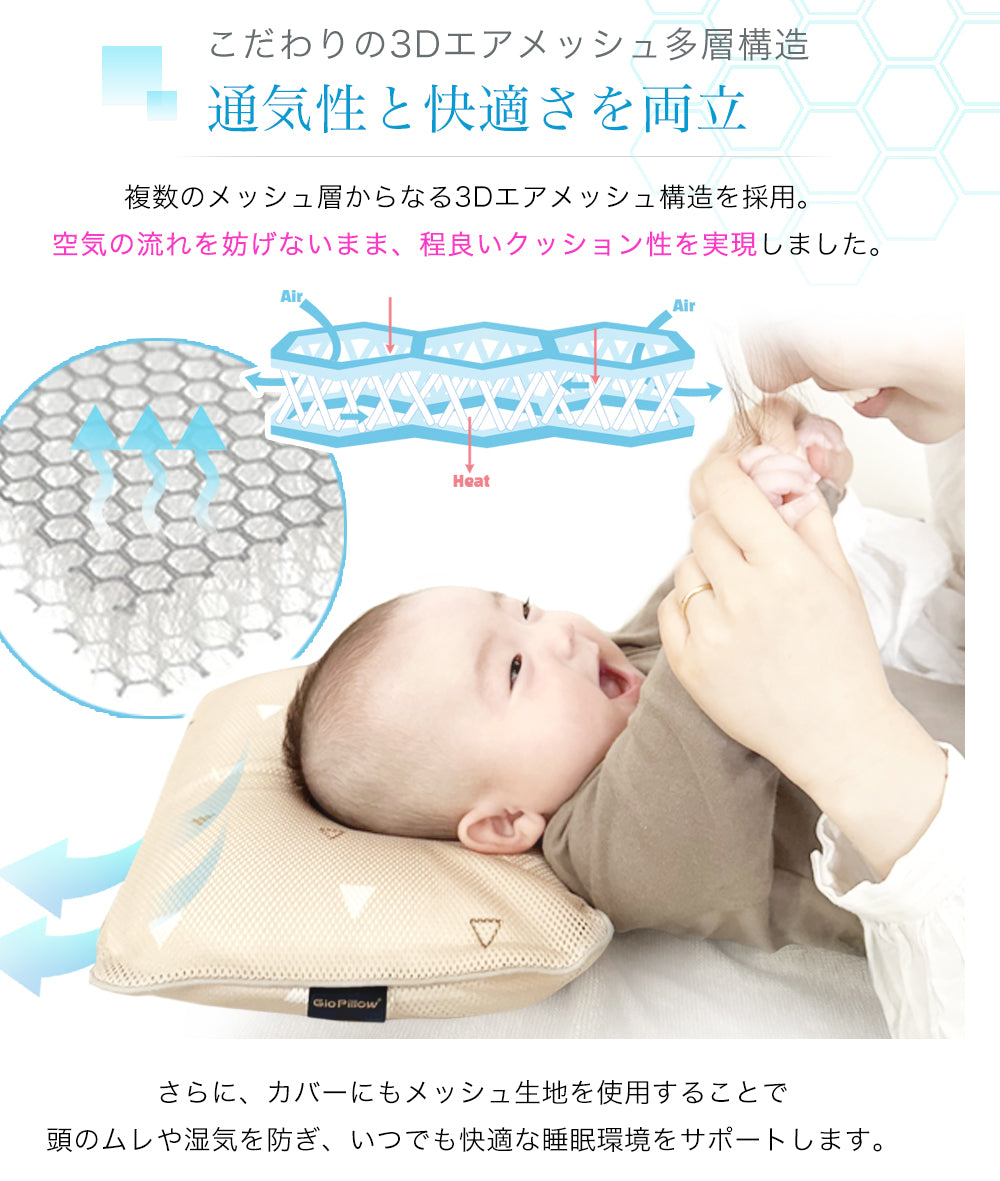 【科学的につくられたジオピロー】 ■赤ちゃんの発育状態に伴う頭の大きさの成長に最適となるようデザインされた頭のくぼみ ■最先端の技術を駆使した殺菌工程、安全な最先端機能のメッシュカバー ■赤ちゃんの首の部分を優しく支え包み込むように最適な角度と高さにデザインされた首のくぼみ ■自然通気性・適度な弾力性を追求した特許構造素材 ■赤ちゃんの頭への圧力を和らげる特許デザインのマルチレイヤーホール |