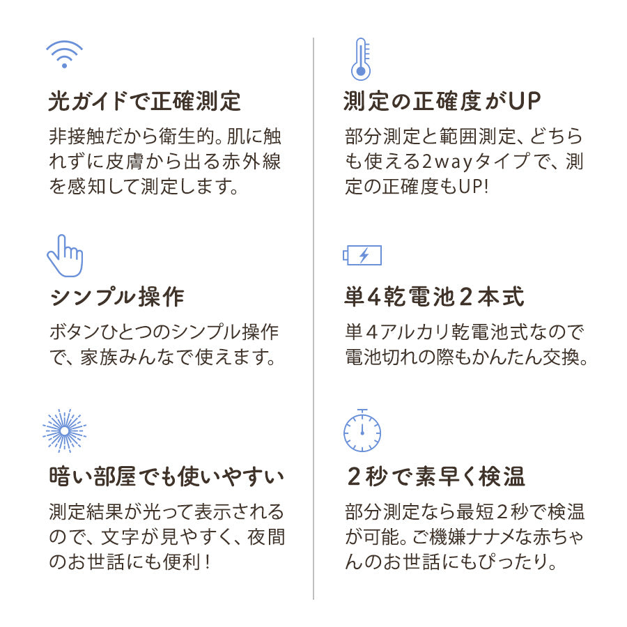 新生児から大人まで。家族みんなで衛生的に使える非接触体温計。 最速2秒で素早く検温!光ガイド機能を付け、正しい測定位置をより視覚化し、正確性をUPしました。 検温結果により変わるバックライト機能で、暗いところでも検温結果がわかりやすいのもポイントです。 |