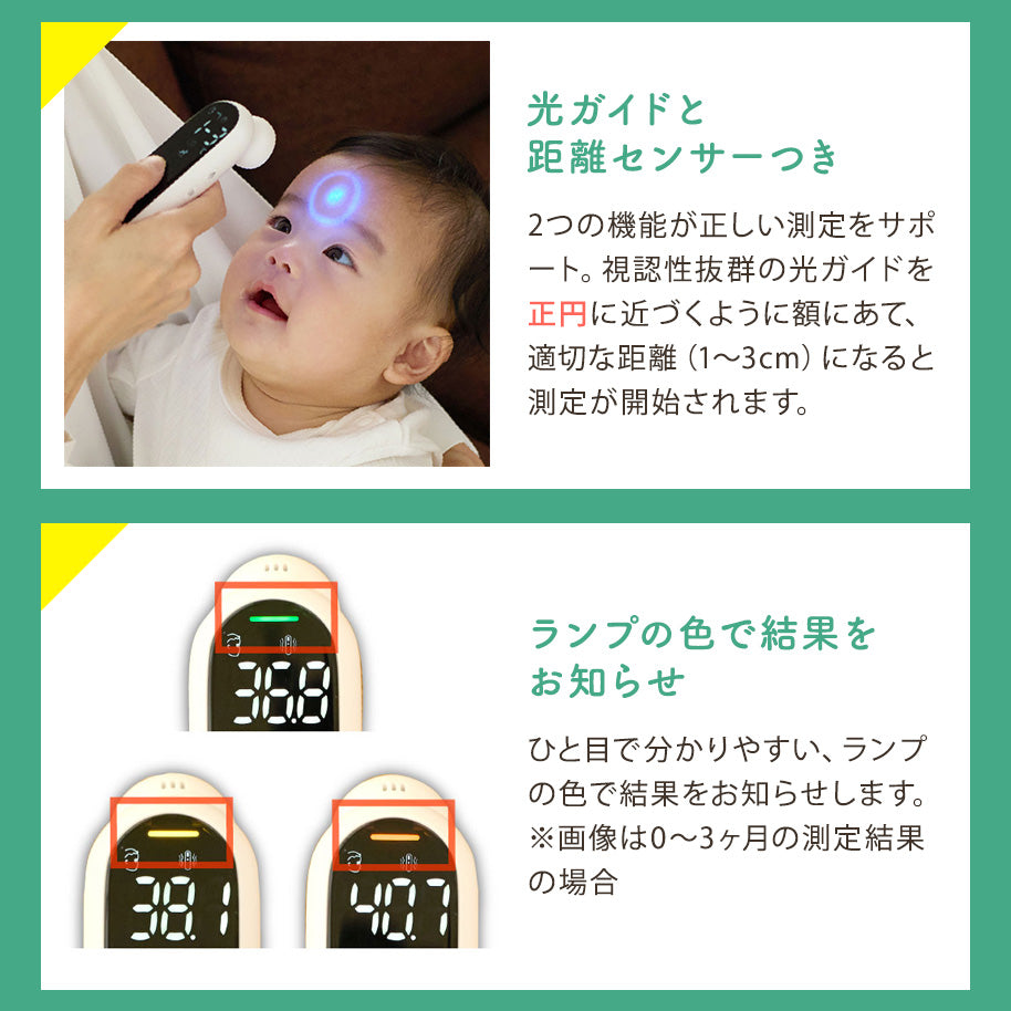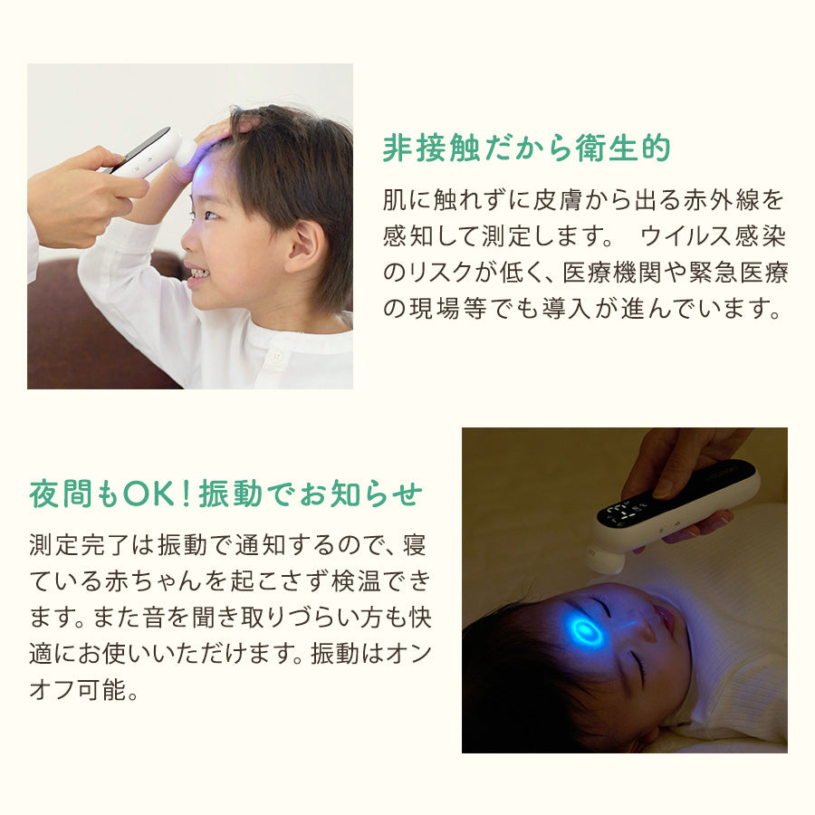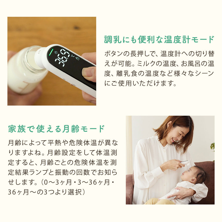 温度計と体温計の多機能2wayタイプ 光ガイドと距離センサーでより精度の高い測定ができる 非接触式の中でも正確な測定のしやすさにこだわりました。測定結果の通知もランプの色や振動で誰でも分かりやすい機能付き。新生児~大人まで家族全員で使える非接触体温計です。 |